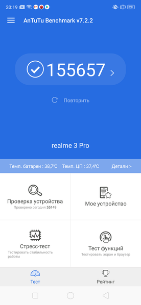 Смартфон realme 3 Pro получил аккумуляторную батарею с большим объемом в 4045 мА·ч. Соответственно, ничто не мешает этому аппарату на экономичной 10-нанометровой SoC демонстрировать очень высокие, гораздо больше чем просто удовлетворительные результаты автономности. В реальной жизни аппарат спокойно доживает до вечерней зарядки, но в щадящем режиме может протянуть и до двух дней.