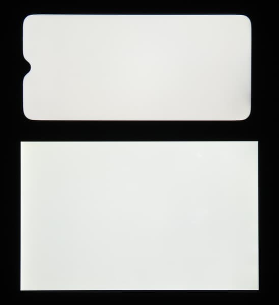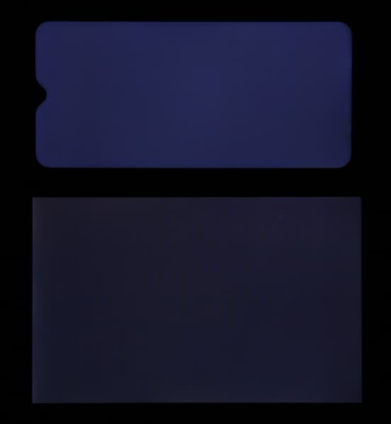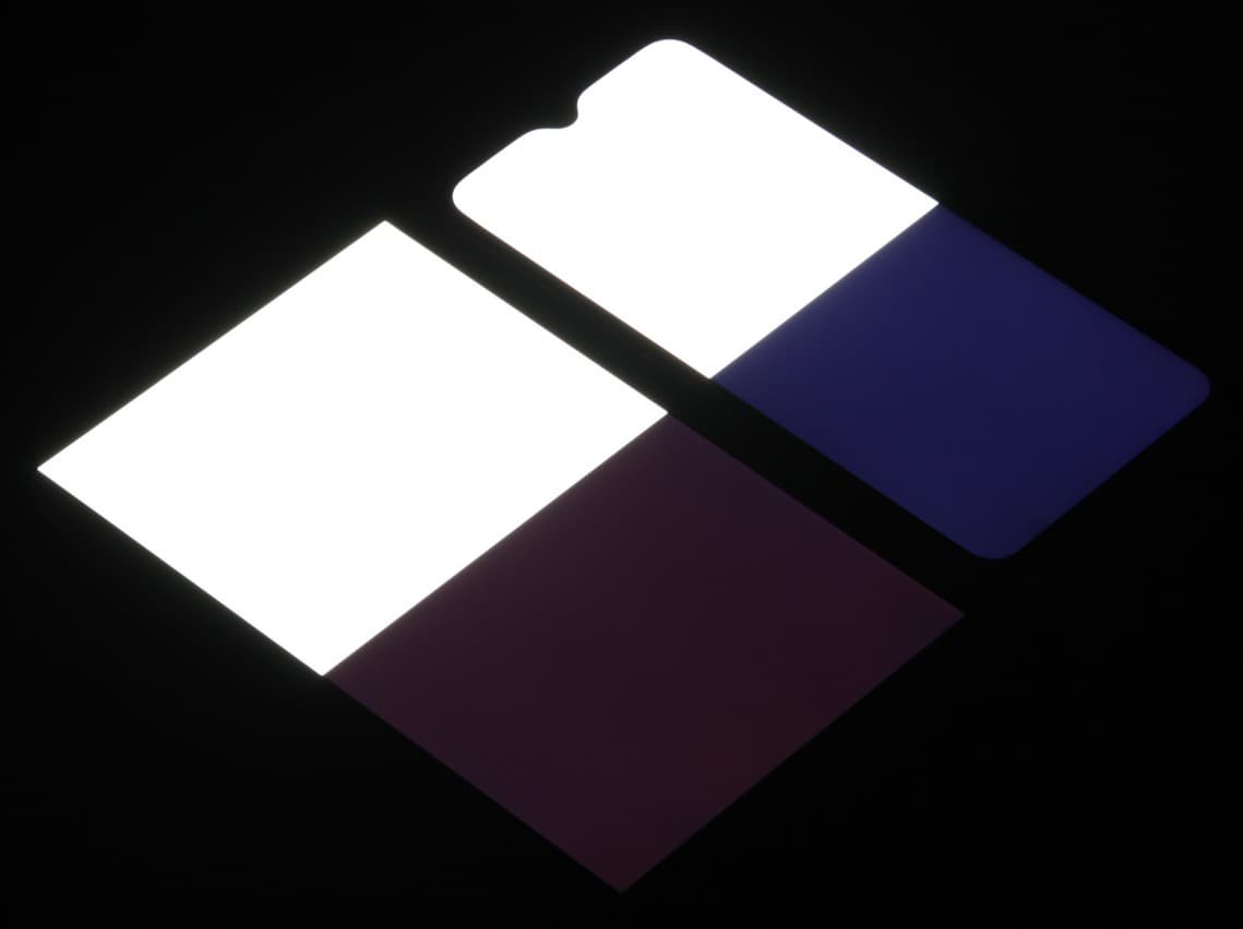 Яркость под углом у экранов уменьшилась (как минимум в 4 раза, исходя из разницы в выдержке), но у realme 3 Pro яркость под этим углом все же чуть выше. Черное поле при отклонении по диагонали высветляется слабо (но все же немного больше, чем у Nexus 7) и приобретает выраженный фиолетовый оттенок. Фотографии ниже это демонстрируют (яркость белых участков в перпендикулярном плоскости экранов направлении одинаковая!):