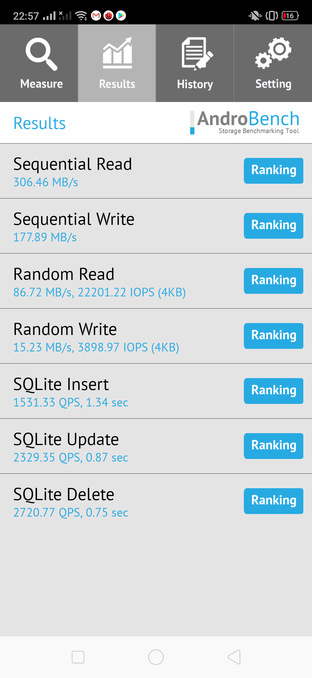 Результаты теста AndroBench на скорость работы с памятью: