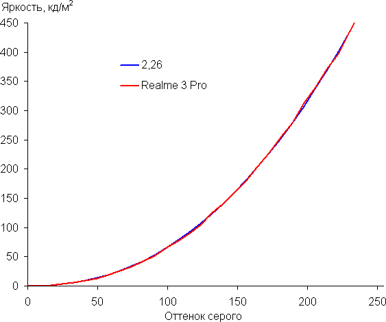 Контрастность (примерно в центре экрана) высокая — порядка 1200:1. Время отклика при переходе черный-белый-черный равно 25 мс (13 мс вкл. + 12 мс выкл.). Переход между полутонами серого 25% и 75% (по численному значению цвета) и обратно в сумме занимает 40 мс. Построенная по 32 точкам с равным интервалом по численному значению оттенка серого гамма-кривая не выявила завала ни в светах, ни в тенях. Показатель аппроксимирующей степенной функции равен 2,26, что немного выше стандартного значения 2,2. При этом реальная гамма-кривая немного отклоняется от степенной зависимости: