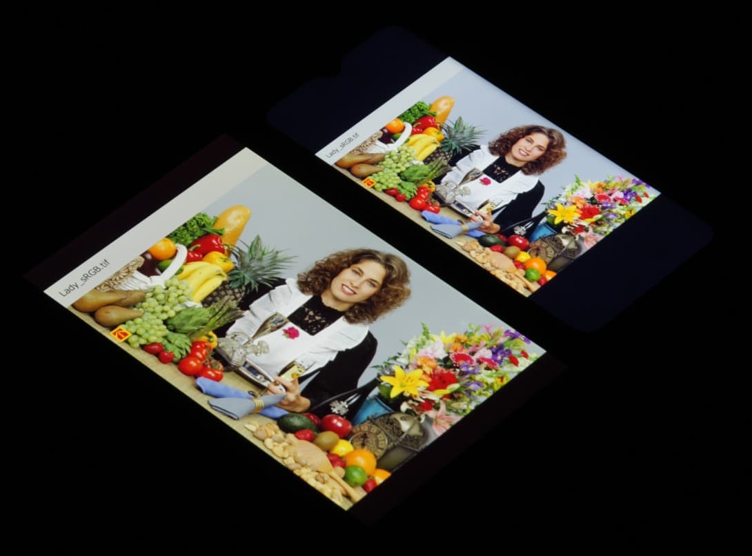 Экран имеет хорошие углы обзора без значительного сдвига цветов даже при больших отклонениях взгляда от перпендикуляра к экрану и без инвертирования оттенков. Для сравнения приведем фотографии, на которых на экраны Realme 5 Pro и Nexus 7 выведены одинаковые изображения, при этом яркость экранов изначально установлена примерно на 200 кд/м², а цветовой баланс на фотоаппарате принудительно переключен на 6500 К.