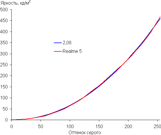 Контрастность (примерно в центре экрана) нормальная — порядка 850:1. Время отклика при переходе черный-белый-черный равно 19 мс (9 мс вкл. + 10 мс выкл.). Переход между полутонами серого 25% и 75% (по численному значению цвета) и обратно в сумме занимает 36 мс. Построенная по 32 точкам с равным интервалом по численному значению оттенка серого гамма-кривая не выявила завала ни в светах, ни в тенях. Показатель аппроксимирующей степенной функции равен 2,08, что ниже стандартного значения 2,2. При этом реальная гамма-кривая немного отклоняется от степенной зависимости: