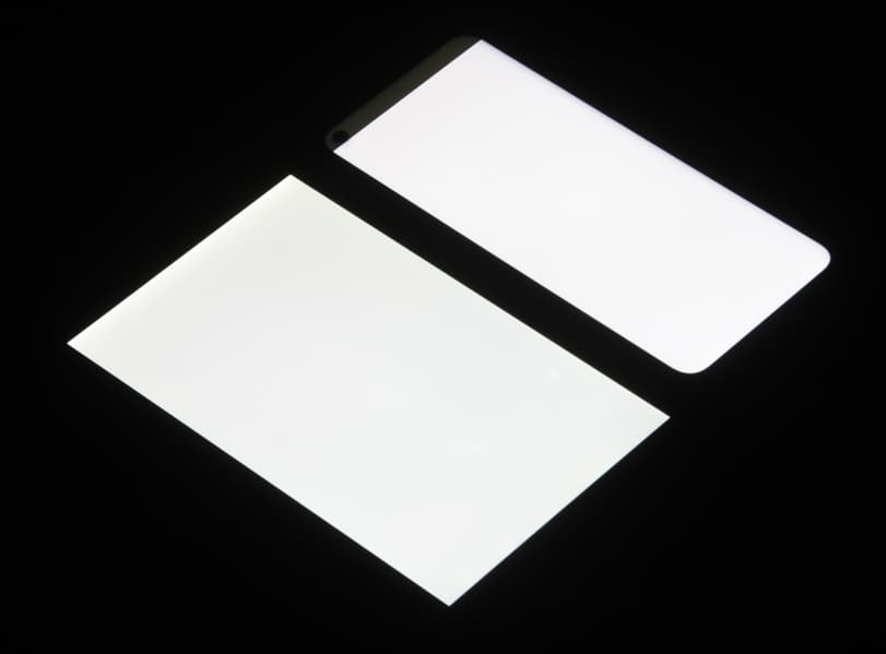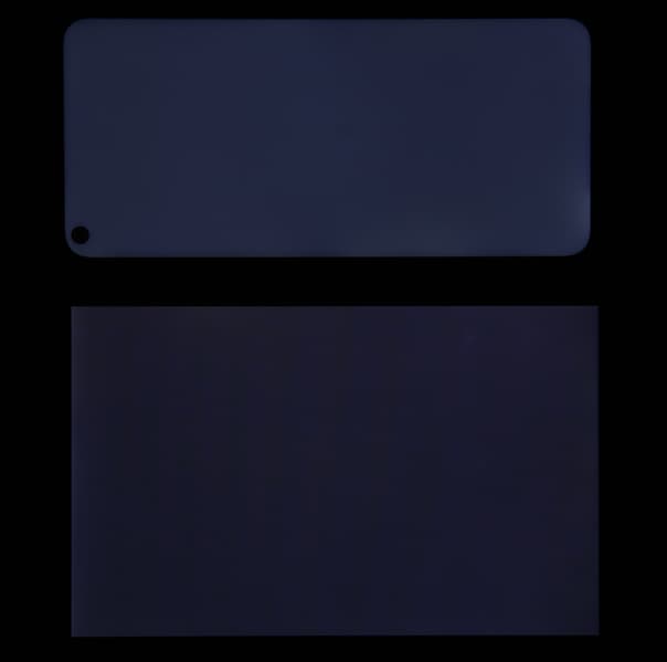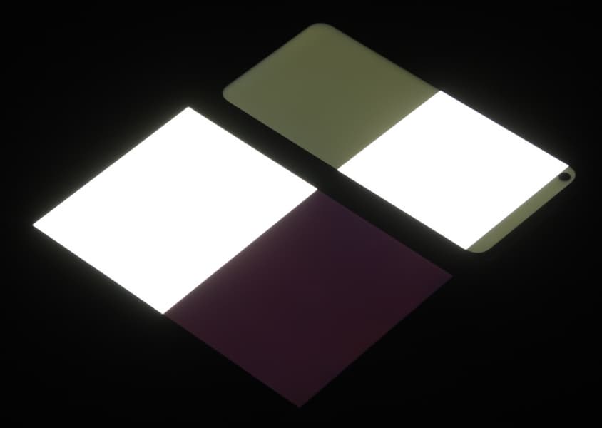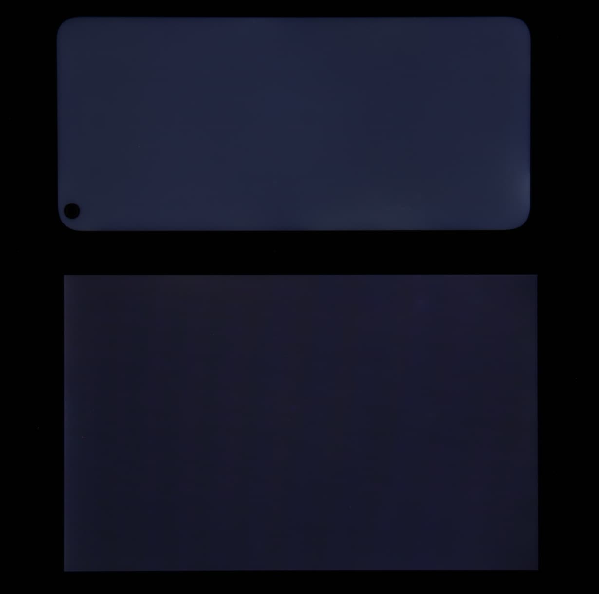 Яркость под углом у экранов уменьшилась (как минимум в 5 раз, исходя из разницы в выдержке), но у Realme 7 яркость под этим углом все же чуть выше. Черное поле при отклонении по диагонали высветляется сильно, но остается условно нейтрально-серым. Фотографии ниже это демонстрируют (яркость белых участков в перпендикулярном плоскости экранов направлении одинаковая!):