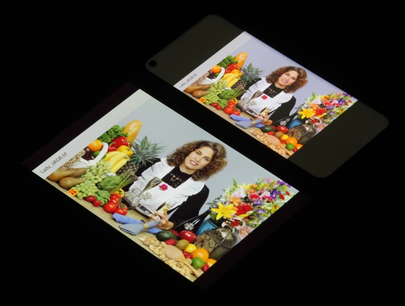 Экран имеет хорошие углы обзора без значительного сдвига цветов даже при больших отклонениях взгляда от перпендикуляра к экрану и без инвертирования оттенков. Для сравнения приведем фотографии, на которых на экраны Realme 7 и Nexus 7 выведены одинаковые изображения, при этом яркость экранов изначально установлена примерно на 200 кд/м², а цветовой баланс на фотоаппарате принудительно переключен на 6500 К.