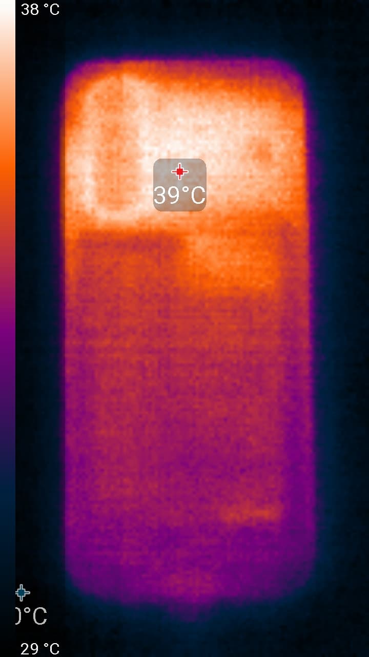 Нагрев больше в верхней части аппарата, что, видимо, соответствует расположению микросхемы SoC. По данным теплокамеры, максимальный нагрев составил 39 градусов (при температуре окружающего воздуха в 24 градуса), это средний нагрев в данном тесте для современных смартфонов.
