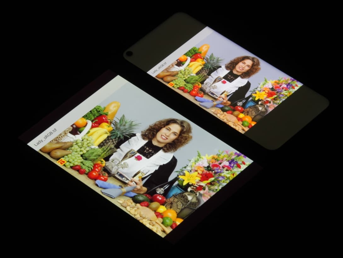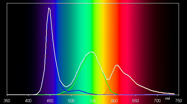 Спектры компонент достаточно хорошо разделены, что и обуславливает широкий цветовой охват. Для потребительского устройства широкий цветовой охват является недостатком, поскольку в итоге цвета изображений — рисунков, фотографий и фильмов, — ориентированных на пространство sRGB (а таких подавляющее большинство), имеют неестественную насыщенность. Особенно это заметно на узнаваемых оттенках, например на оттенках кожи. Результат приведен на фотографиях выше.