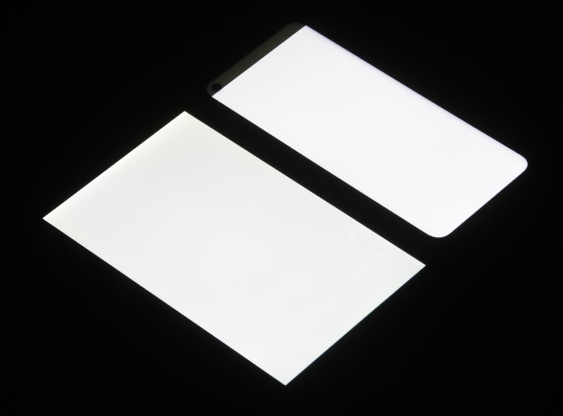 Лицевая поверхность экрана выполнена в виде стеклянной пластины с зеркально-гладкой поверхностью, устойчивой к появлению царапин. Судя по отражению объектов, антибликовые свойства экрана лучше, чем у экрана Google Nexus 7 (2013) (далее просто Nexus 7). Для наглядности приведем фотографию, на которой в выключенных экранах отражается белая поверхность (слева — Nexus 7, справа — Realme 7, далее их можно различать по размеру):