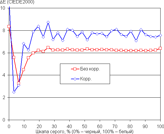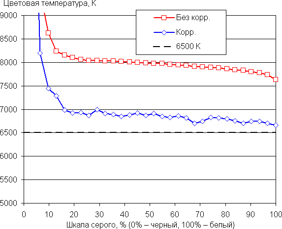Результат после ручной коррекции (мы сдвинули ползунок в крайнее правое положение) получше (см. графики ниже), поскольку цветовая температура снижается, а отклонение от спектра абсолютно черного тела (ΔE) на большей части шкалы серого остается ниже 10, что для потребительского устройства считается приемлемым показателем. При этом цветовая температура и ΔE мало изменяются от оттенка к оттенку — это положительно сказывается на визуальной оценке цветового баланса. (Самые темные области шкалы серого можно не учитывать, так как там баланс цветов не имеет большого значения, да и погрешность измерений цветовых характеристик на низкой яркости большая.)