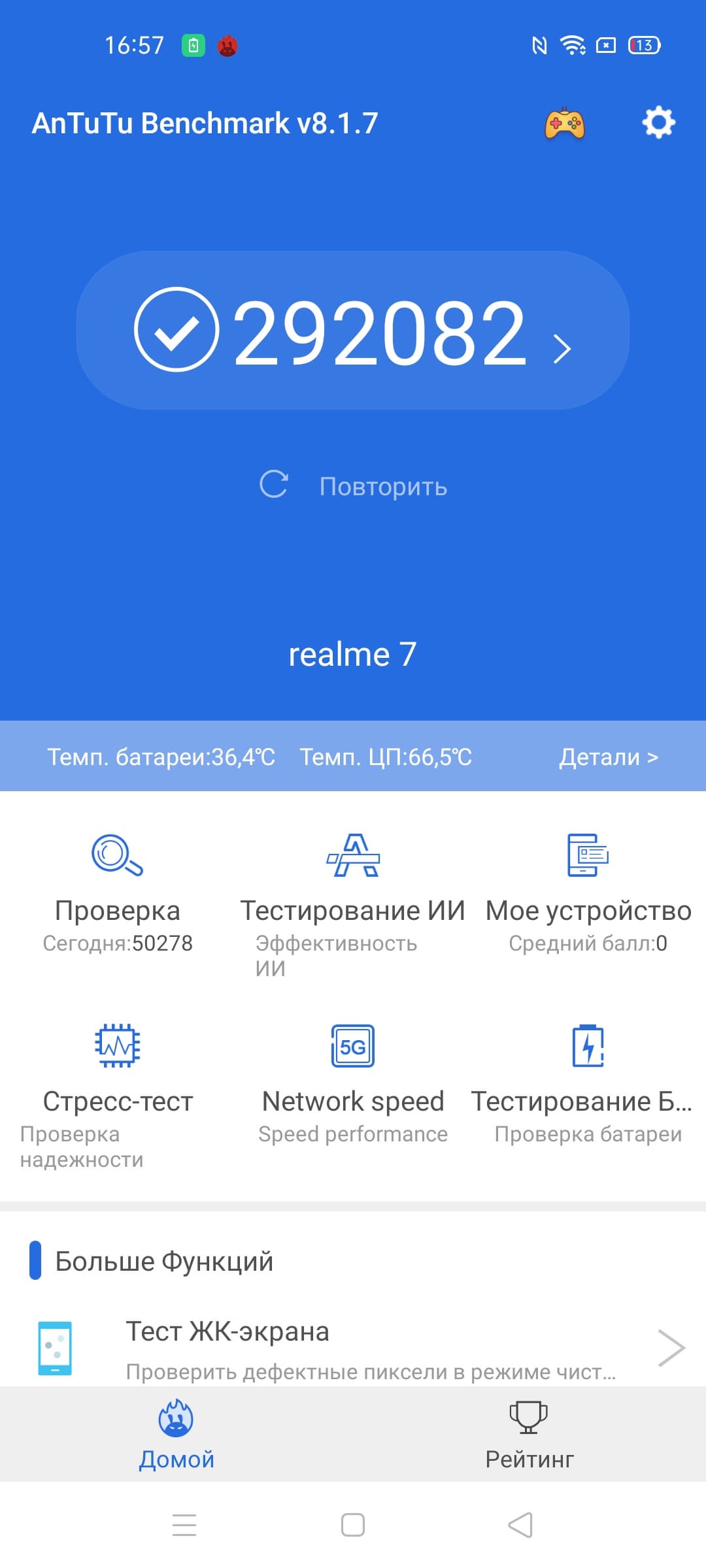 Realme 7 имеет встроенную батарею с повышенным объемом 5000 мА·ч, но нельзя сказать, что это помогло ему показать впечатляющее время автономной работы, хотя оно и выше среднего. Наверное, MediaTek никогда не научится делать по-настоящему экономичные платформы. Впрочем, в реальной эксплуатации аппарат проживает чуть более долгую жизнь вдали от розетки — может протянуть более суток при щадящей эксплуатации.