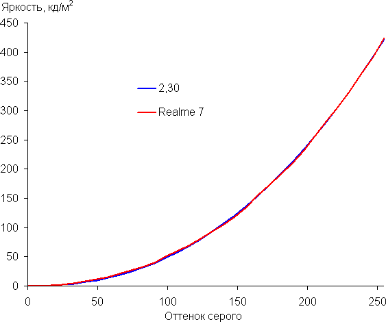 Контрастность (примерно в центре экрана) высокая — порядка 1300:1. Время отклика при переходе черный-белый-черный равно 16 мс (8 мс вкл. + 8 мс выкл.). Переход между полутонами серого 25% и 75% (по численному значению цвета) и обратно в сумме занимает 28 мс. Построенная по 32 точкам с равным интервалом по численному значению оттенка серого гамма-кривая не выявила завала ни в светах, ни в тенях. Показатель аппроксимирующей степенной функции равен 2,30, что немного выше стандартного значения 2,2. При этом реальная гамма-кривая мало отклоняется от степенной зависимости: