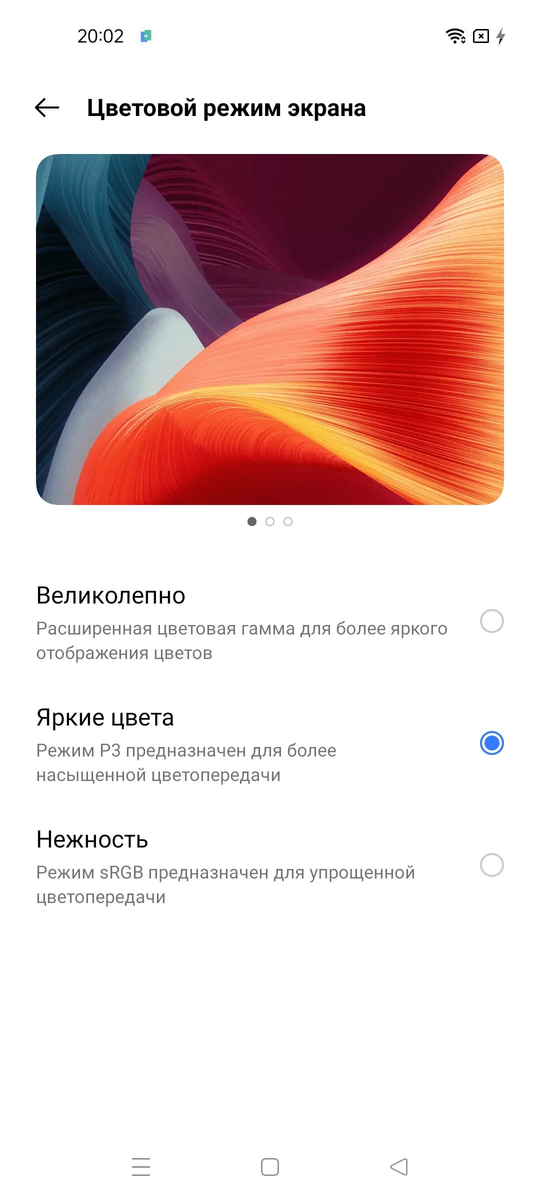 Фотография выше получена для профиля Яркие цвета в настройках экрана, который выбран по умолчанию. Профилей всего три: