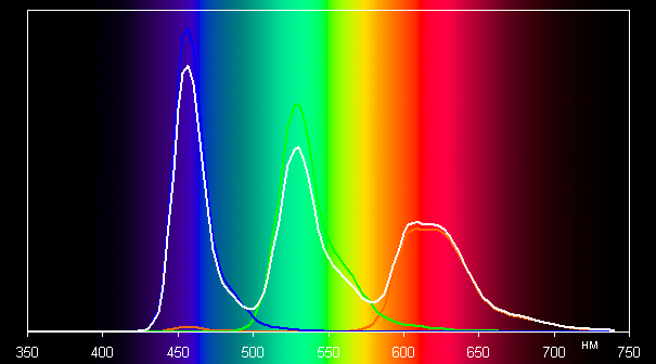 Баланс оттенков на шкале серого после выбора профиля Нежность хороший — цветовая температура достаточно близка к стандартным 6500 К, при этом на значимом участке шкалы серого этот параметр изменяется не очень сильно, что улучшает визуальное восприятие баланса цветов. Отклонение от спектра абсолютно черного тела (ΔE) ниже 10 единиц, что для потребительского устройства считается хорошим показателем, и разброс этой характеристики также не очень большой: