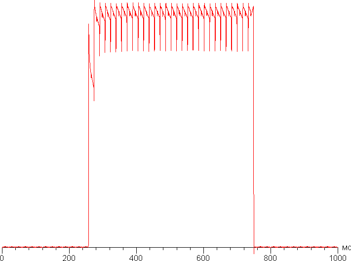 Переключение состояния элементов матрицы выполняется практически мгновенно, но на фронте включения может присутствовать ступенька шириной примерно 17 мс (что соответствует частоте обновления экрана примерно в 60 Гц). Например, так выглядит зависимость яркости от времени при переходе от черного к белому и обратно: