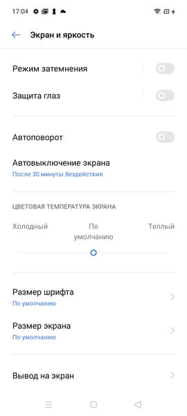 При ручном управлении яркостью и при выводе белого поля во весь экран максимальное значение яркости составило около 440 кд/м². Максимальная яркость не очень высокая, но, учитывая отличные антибликовые свойства, читаемость экрана даже в солнечный день вне помещения должна быть на приемлемом уровне. Минимальное значение яркости — 1,9 кд/м², поэтому в полной темноте яркость можно понизить до комфортного значения. В наличии автоматическая регулировка яркости по датчику освещенности (он находится на фронтальной панели очень близко к ее верхнему краю справа от решетки фронтального громкоговорителя). В автоматическом режиме при изменении внешних условий освещенности яркость экрана как повышается, так и понижается. Работа этой функции зависит от положения ползунка регулировки яркости: им пользователь может попытаться выставить желаемый уровень яркости в текущих условиях. Если не вмешиваться, то в полной темноте функция автояркости уменьшает яркость до 12 кд/м² (нормально), в условиях освещенного искусственным светом офиса (примерно 550 лк) устанавливает на 140 кд/м² (подходит), под очень ярким светом, условно на прямом солнечном свету, повышает до 440 кд/м² (до максимума, что и нужно). Уровень яркости подсветки зависит от положения ползунка в темноте и в средних условиях, а в очень ярком окружении всегда устанавливается максимум. Результат по умолчанию нас удовлетворил, но для эксперимента мы попробовали понизить яркость в полной темноте — подвинули ползунок чуть влево. Яркость стала ниже, но после цикла повышения внешней освещенности и ее снижения, все вернулось к тем же значениям, что были до вмешательства. Получается, что функция автоподстройки яркости хоть и работает адекватно, но не позволяет пользователю настраивать свою работу под индивидуальные требования. На любом уровне яркости значимая модуляция подсветки отсутствует, поэтому нет и никакого мерцания экрана.