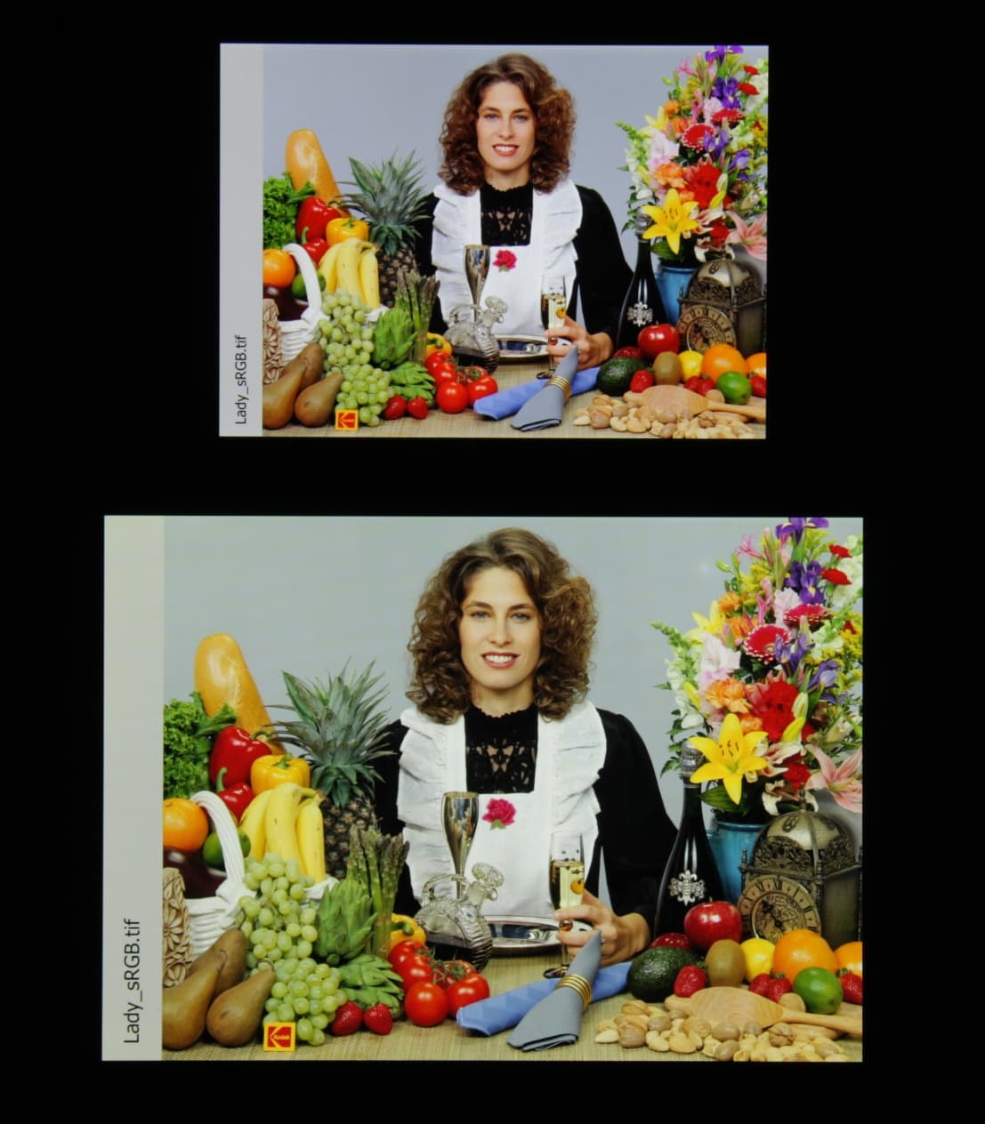 В этом аппарате есть динамическая подстройка яркости подсветки в соответствии с характером выводимого изображения — на темных в среднем изображениях яркость подсветки уменьшается. В итоге полученная зависимость яркости от оттенка (гамма-кривая) не строго соответствует гамма-кривой статичного изображения, так как измерения проводились при последовательном выводе оттенков серого почти на весь экран. По этой причине ряд тестов — определение контрастности и времени отклика, сравнение засветки черного под углами — мы проводили (впрочем, как и всегда) при выводе специальных шаблонов с неизменной средней яркостью, а не однотонных полей во весь экран. Вообще, такая неотключаемая коррекция яркости ничего кроме вреда не приносит, поскольку постоянная смена яркости экрана как минимум может вызывать некоторый дискомфорт, снижает различимость градаций в тенях в случае темных изображений и читаемость экрана на ярком свету, так как на не самых светлых в среднем изображениях яркость подсветки существенно занижается.