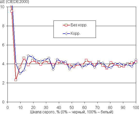 Результат после ручной коррекции (крайнее правое положение ползунка) хороший, так как цветовая температура становится достаточно близкой к стандартным 6500 К, а отклонение от спектра абсолютно черного тела (ΔE) остается ниже 10, что для потребительского устройства считается приемлемым показателем. При этом цветовая температура и ΔE мало изменяются от оттенка к оттенку — это положительно сказывается на визуальной оценке цветового баланса. (Самые темные области шкалы серого можно не учитывать, так как там баланс цветов не имеет большого значения, да и погрешность измерений цветовых характеристик на низкой яркости большая.)
