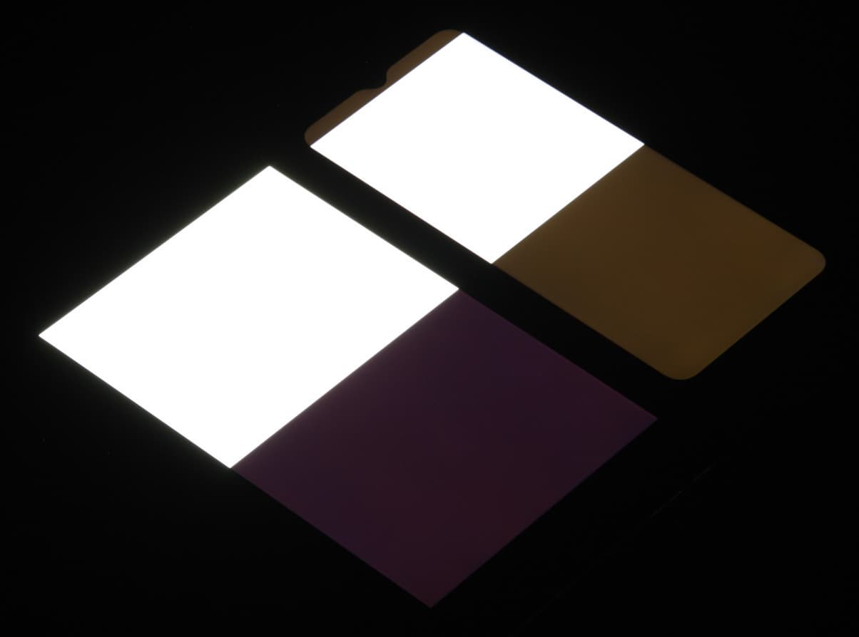 Яркость под углом у экранов уменьшилась (как минимум в 5 раз, исходя из разницы в выдержке), но в случае Realme C21 яркость снизилась сильнее. Черное поле при отклонении по диагонали сильно высветляется и приобретает легкий коричневатый оттенок. Фотографии ниже это демонстрируют (яркость белых участков в перпендикулярном плоскости экранов направлении одинаковая!):