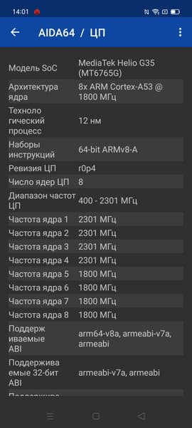 - SoC MediaTek Helio G35, 8 ядер (4×Cortex-A53 @2,3 ГГц и 4×Cortex-A53 @1,8 ГГц)