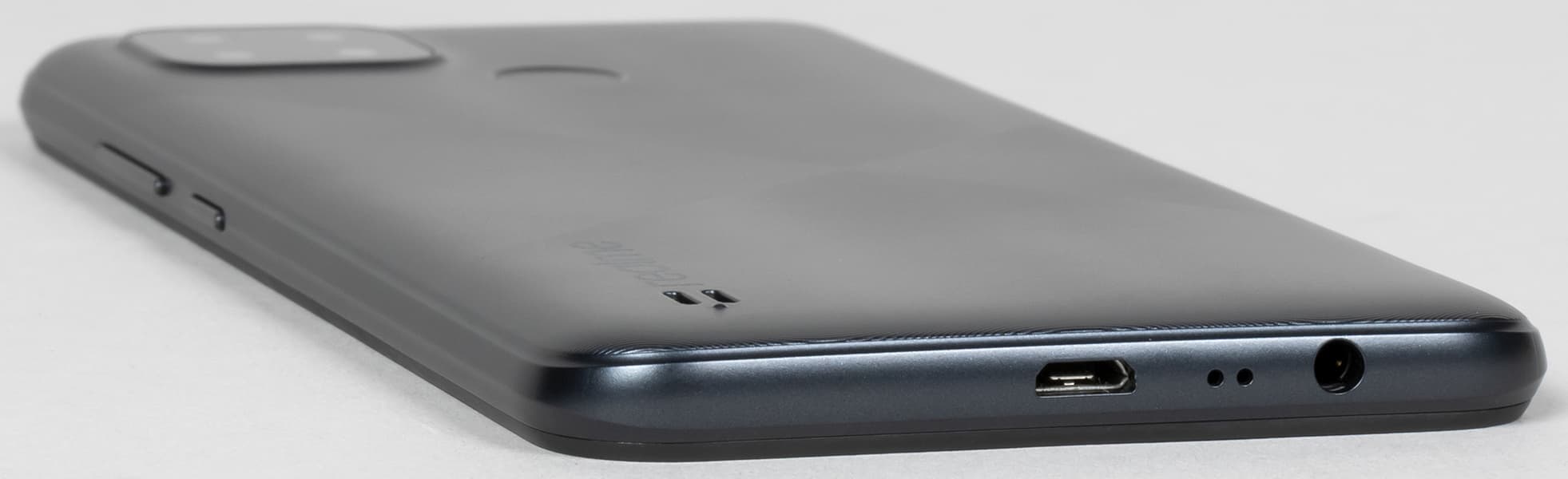 Realme C21 оформлен в точно таком же неброском, но практичном стиле, как и все его сородичи по серии Realme С. Здесь нет глянца и блестяшек, корпус выполнен из матовой пластмассы с нанесенной на нее мелкой текстурой в виде геометрического рисунка. Благодаря ей смартфон не скользит в руке и не собирает отпечатки пальцев на своей шероховатой поверхности.