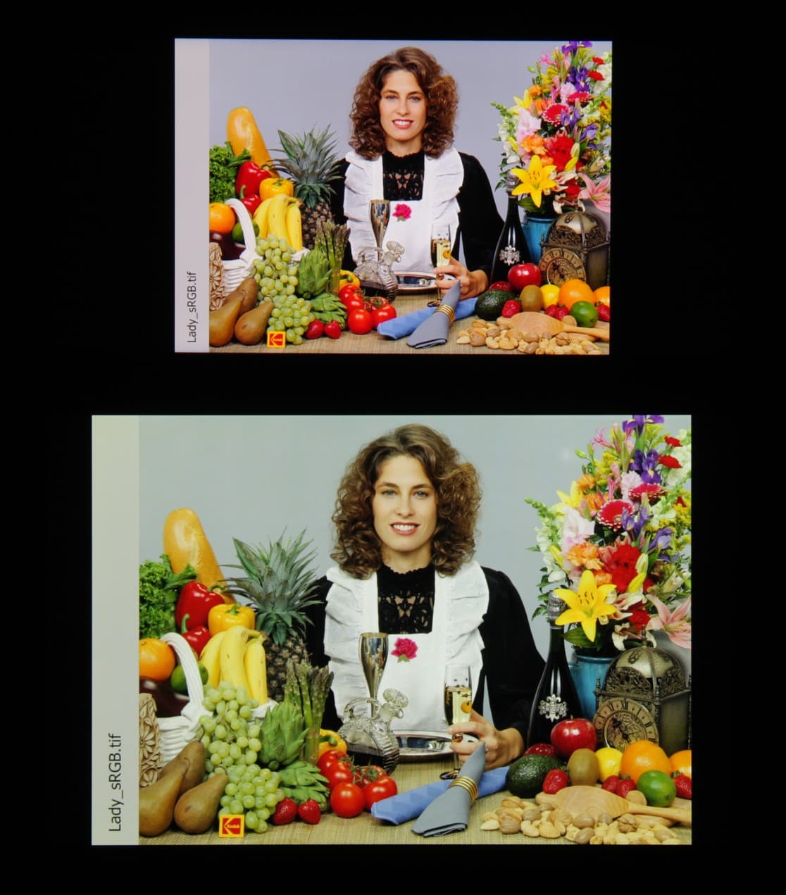 Спектры компонент достаточно хорошо разделены, что и обуславливает широкий цветовой охват. Для потребительского устройства широкий цветовой охват является недостатком, поскольку в итоге цвета изображений — рисунков, фотографий и фильмов, — ориентированных на пространство sRGB (а таких подавляющее большинство), имеют неестественную насыщенность. Особенно это заметно на узнаваемых оттенках, например на оттенках кожи. Результат приведен на фотографиях выше. Впрочем, не все так плохо: при выборе профиля Мягкий охват сжимается до границ sRGB.