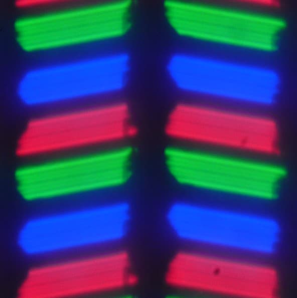 В данном смартфоне используется матрица типа IPS. Микрофотографии демонстрируют типичную для IPS структуру субпикселей: