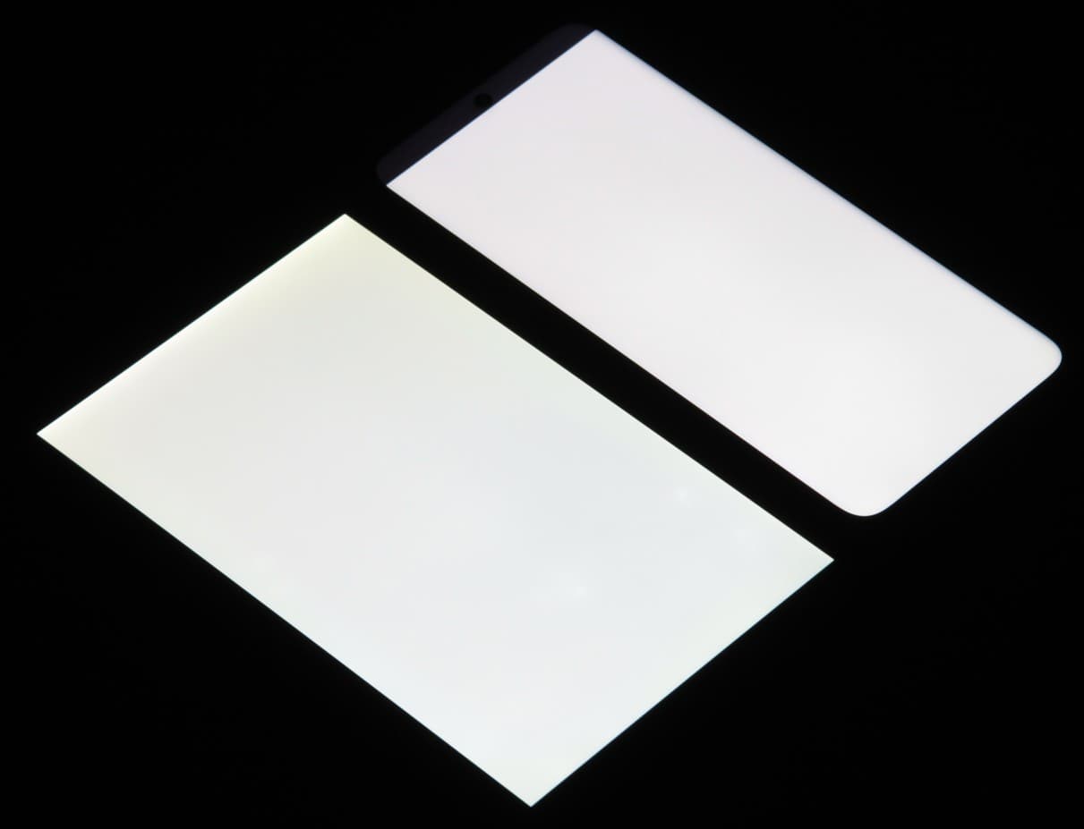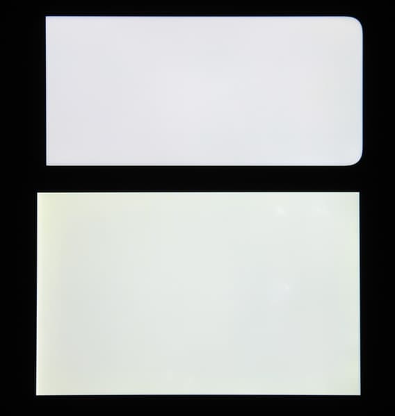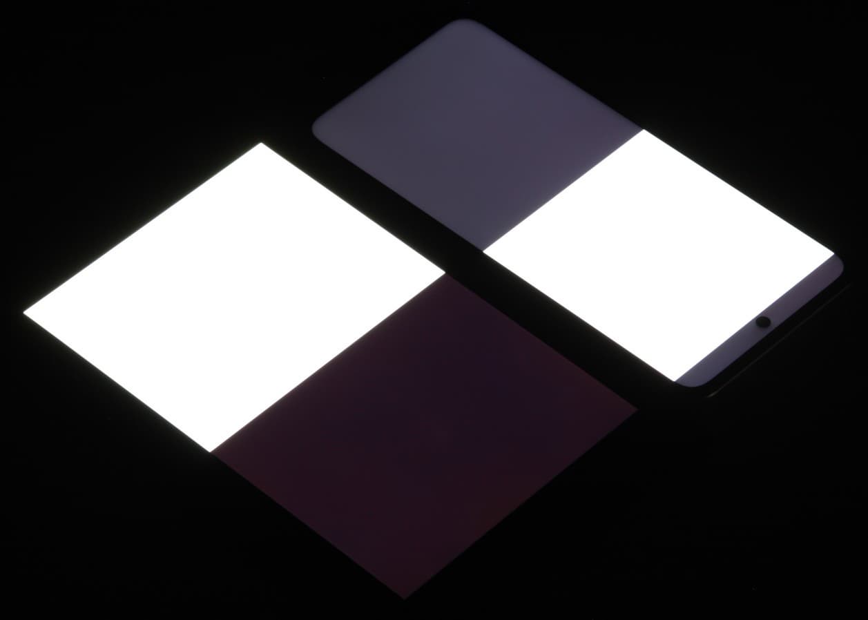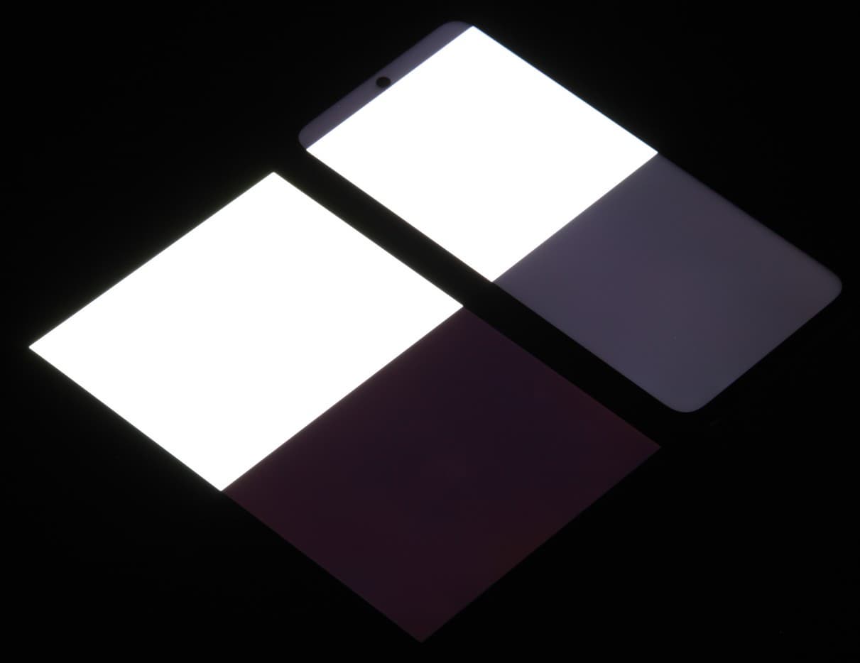 Яркость под углом у экранов уменьшилась (как минимум в 5 раз, исходя из разницы в выдержке), и уменьшилась примерно одинаково. Черное поле при отклонении по диагонали сильно высветляется и приобретает красно-фиолетовый оттенок. Фотографии ниже это демонстрируют (яркость белых участков в перпендикулярном плоскости экранов направлении одинаковая!):