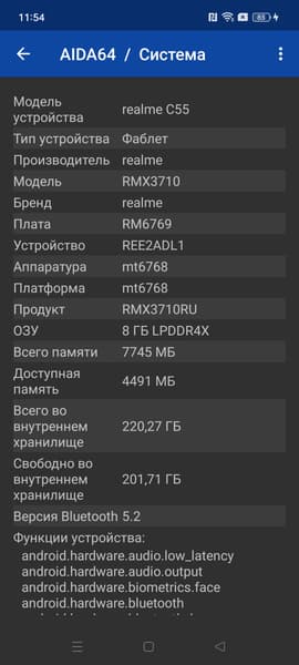 Realme C55 работает на SoC Mediatek Helio G88 с восемью процессорными ядрами: 2 ядра Cortex-A75 на 2000 МГц и 6 ядер Cortex-A55 на 1800 МГц. Роль графического процессора выполняет GPU Mali-G52 MP2.