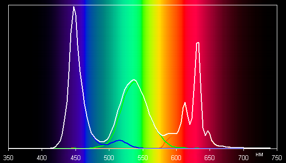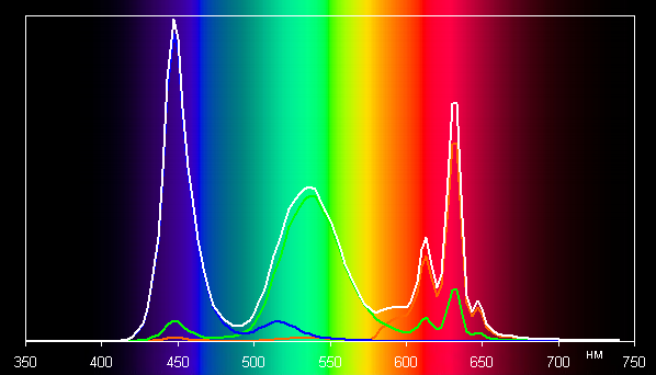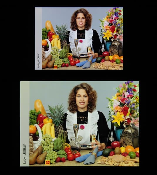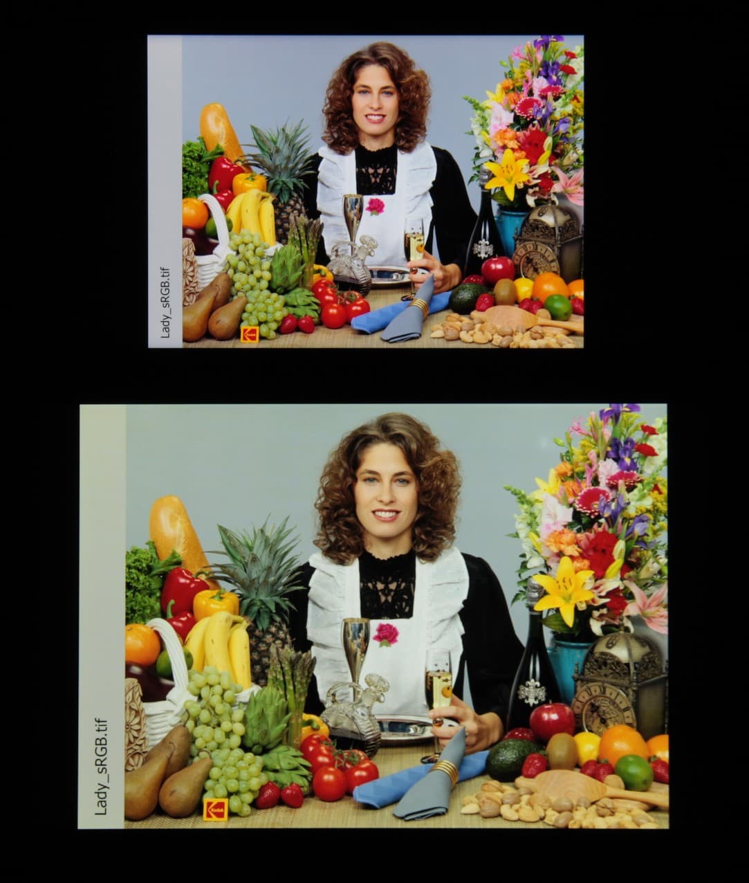 Спектры компонент достаточно хорошо разделены, что и обуславливает широкий цветовой охват. Для потребительского устройства широкий цветовой охват является недостатком, поскольку в итоге цвета изображений — рисунков, фотографий и фильмов, — ориентированных на пространство sRGB (а таких подавляющее большинство), имеют неестественную насыщенность. Особенно это заметно на узнаваемых оттенках, например на оттенках кожи. Результат приведен на фотографиях выше. Впрочем, не все так плохо: при выборе профиля Естественный охват сжимается до границ sRGB.