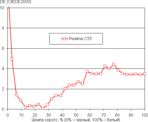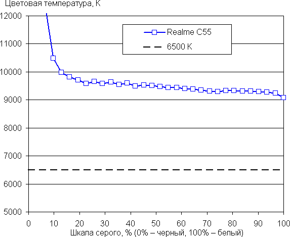 По умолчанию цветовая температура существенно выше стандартных 6500 К. Однако, в этом устройстве есть возможность скорректировать цветовой баланс с помощью регулировки оттенка (см. снимок выше). К сожалению, при выборе профиля Естественный, в котором цвета естественные, регулировка оттенка (или применение функции Защита глаз) неожиданно для пользователя сбрасывает цветовой охват до исходного состояния. Впрочем, отклонение от спектра абсолютно черного тела (ΔE) на шкале серого остается ниже 10, что для потребительского устройства считается приемлемым показателем. При этом цветовая температура и ΔE на большей части шкалы серого мало изменяются от оттенка к оттенку — это положительно сказывается на визуальной оценке цветового баланса. (Самые темные области шкалы серого можно не учитывать, так как там баланс цветов не имеет большого значения, да и погрешность измерений цветовых характеристик на низкой яркости большая.)