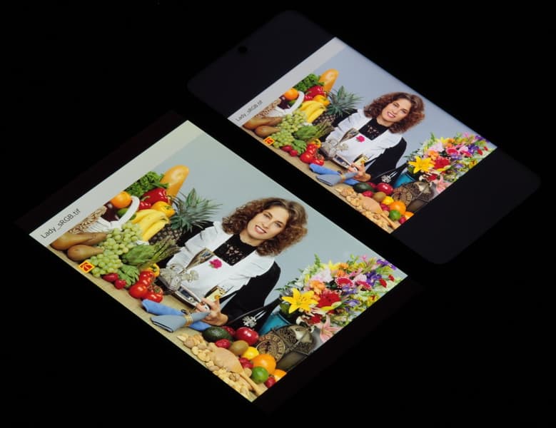 Экран имеет хорошие углы обзора без значительного сдвига цветов даже при больших отклонениях взгляда от перпендикуляра к экрану и без инвертирования оттенков. Для сравнения приведем фотографии, на которых на экраны Realme C55 и Nexus 7 выведены одинаковые изображения, при этом яркость экранов изначально установлена примерно на 200 кд/м², а цветовой баланс на фотоаппарате принудительно переключен на 6500 К.
