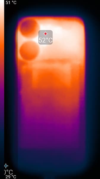 Нагрев больше в верхней части аппарата, что, видимо, соответствует расположению микросхемы SoC. По данным теплокамеры, максимальный нагрев составил 52 градуса (при температуре окружающего воздуха в 24 градуса), это выше среднего значения в случае данного теста в сравнении с другими современными смартфонами.