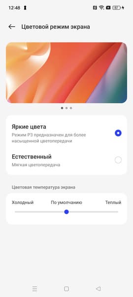 Фотография выше получена для профиля Яркие цвета в настройках экрана, который выбран по умолчанию. Профилей всего два: