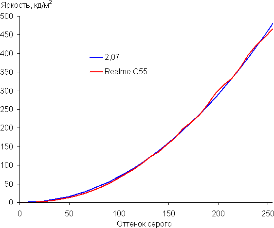 Построенная по 32 точкам с равным интервалом по численному значению оттенка серого гамма-кривая не выявила завала ни в светах, ни в тенях. Показатель аппроксимирующей степенной функции равен 2,07, что ниже стандартного значения 2,2. При этом реальная гамма-кривая немного отклоняется от степенной зависимости: