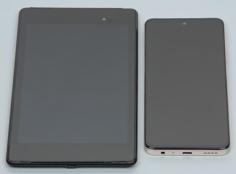 Лицевая поверхность экрана выполнена в виде стеклянной пластины с зеркально-гладкой поверхностью, устойчивой к появлению царапин. Судя по отражению объектов, антибликовые свойства экрана лучше, чем у экрана Google Nexus 7 (2013) (далее просто Nexus 7). Для наглядности приведем фотографию, на которой в выключенных экранах отражается белая поверхность (слева — Nexus 7, справа — Realme C55, далее их можно различать по размеру):