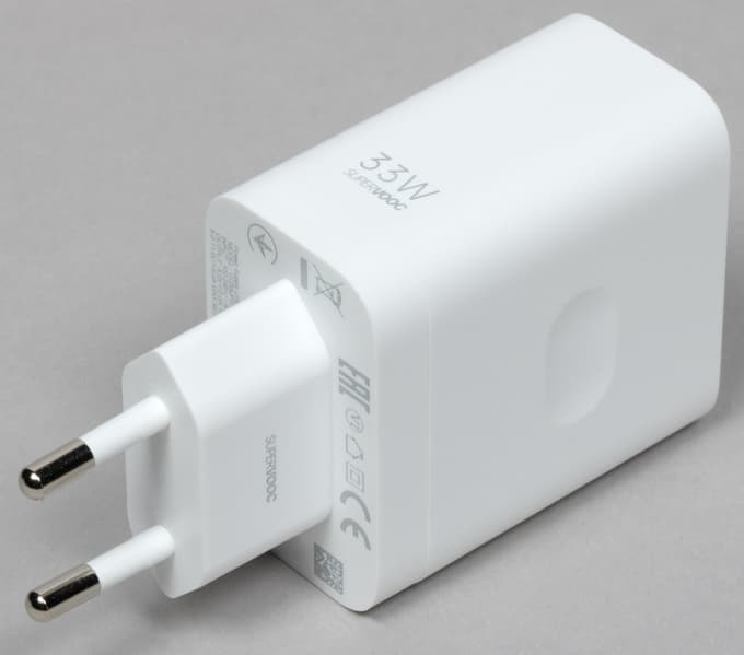 В комплекте со смартфоном идет зарядное устройство с максимальной выходной мощностью 33 Вт, соединительный кабель и защитный чехол.