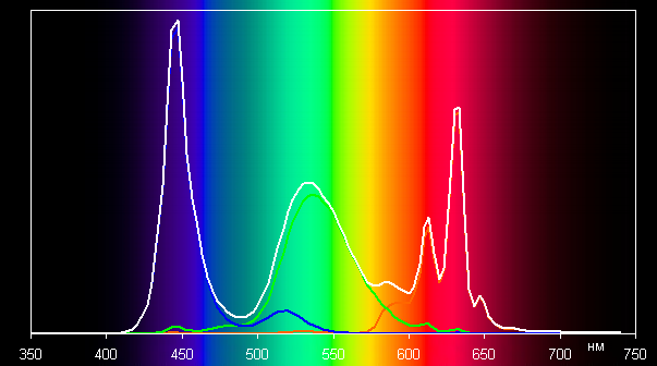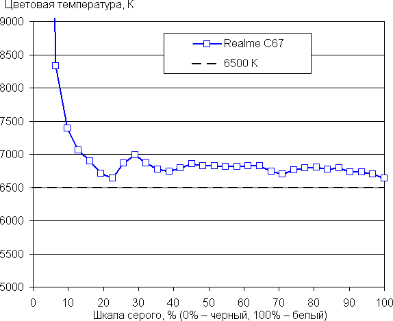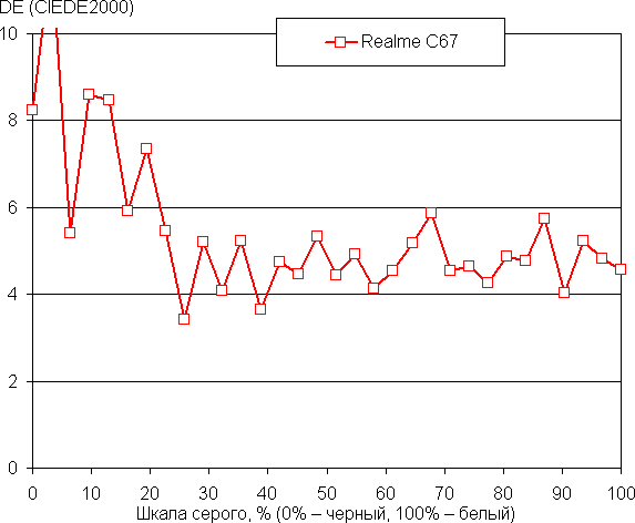 В этом устройстве есть возможность скорректировать цветовой баланс с помощью регулировки оттенка на цветовом круге или просто выбором одного из трех предустановленных профилей. К сожалению, при выборе профиля Мягкий с охватом sRGB, эти настройки заблокированы. Баланс оттенков на шкале серого после выбора профиля Яркий и ручной коррекции цветового баланса (точка на круге коррекции — как на снимке выше) приемлемый, так как цветовая температура близка к стандартным 6500 К (без коррекции — около 8000 К на белом поле), и отклонение от спектра абсолютно черного тела (ΔE) ниже 10, что для потребительского устройства считается приемлемым показателем. (Самые темные области шкалы серого можно не учитывать, так как там баланс цветов не имеет большого значения, да и погрешность измерений цветовых характеристик на низкой яркости большая.)