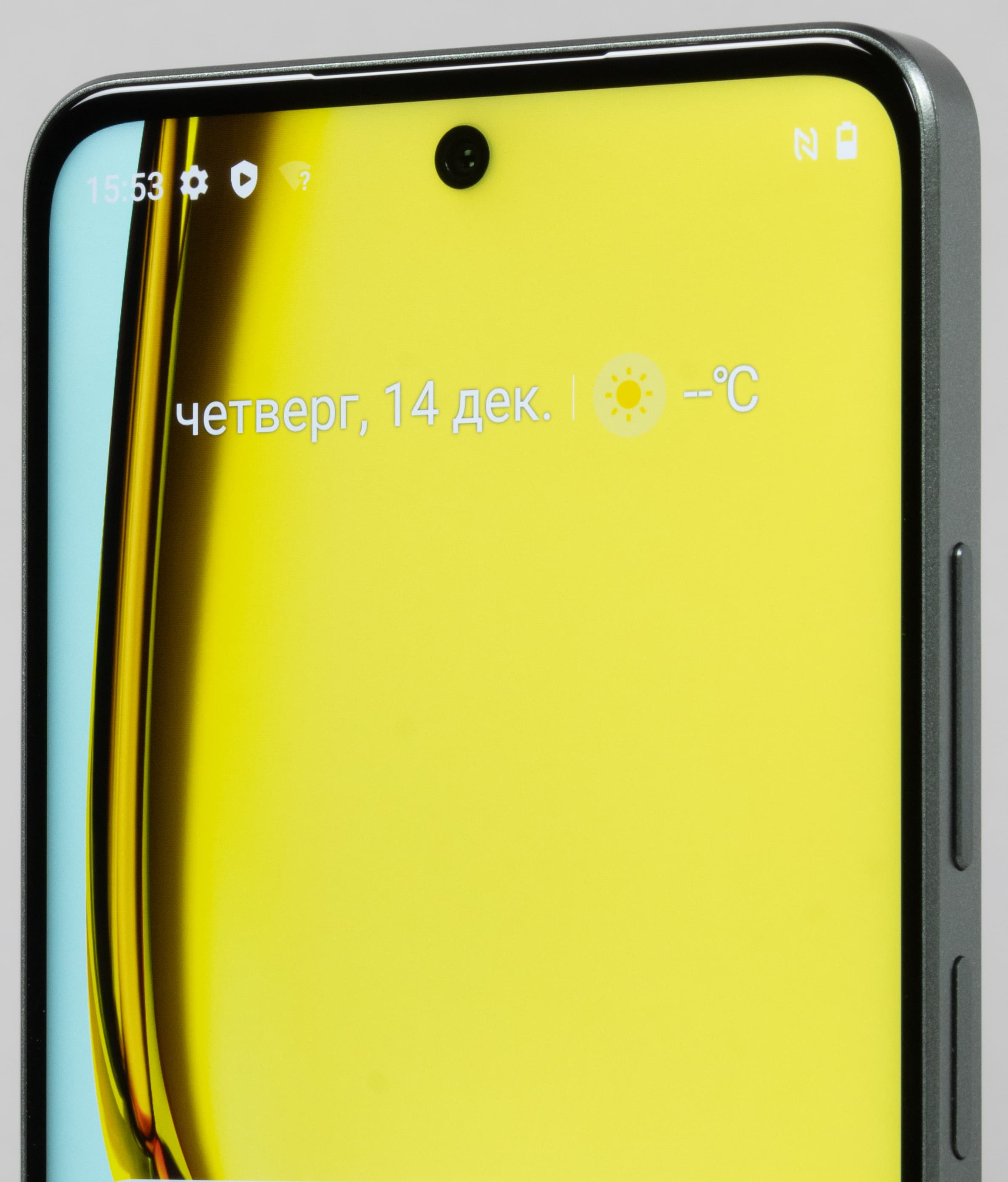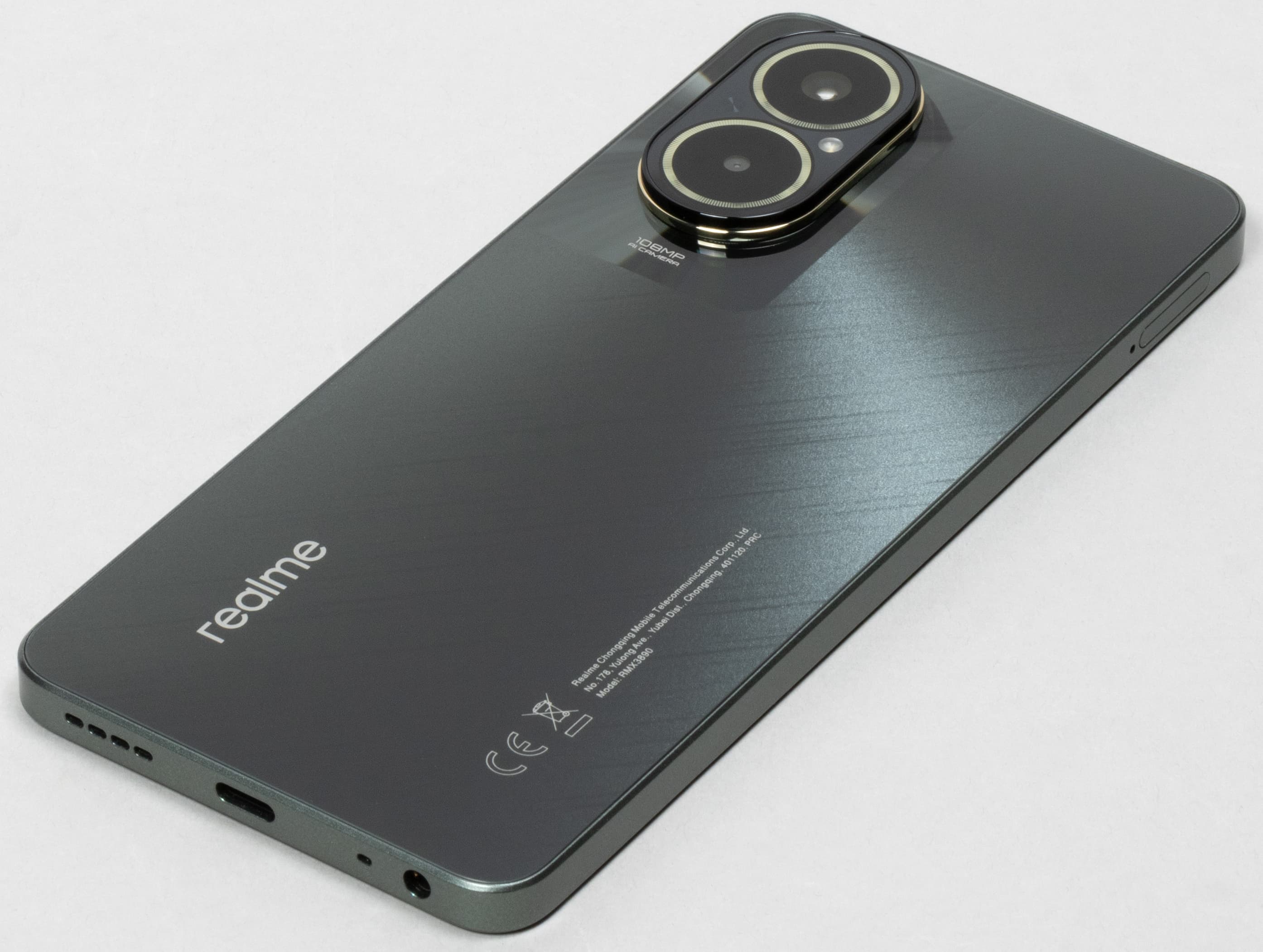 Дизайн у Realme C67 современный и актуальный: панели и боковые грани прямые и плоские, переходы четкие и резкие, обтекаемых и зауженных форм тут нет. Аппарат за счет широкой боковой рамки практичен и крепко удерживается в ладони.