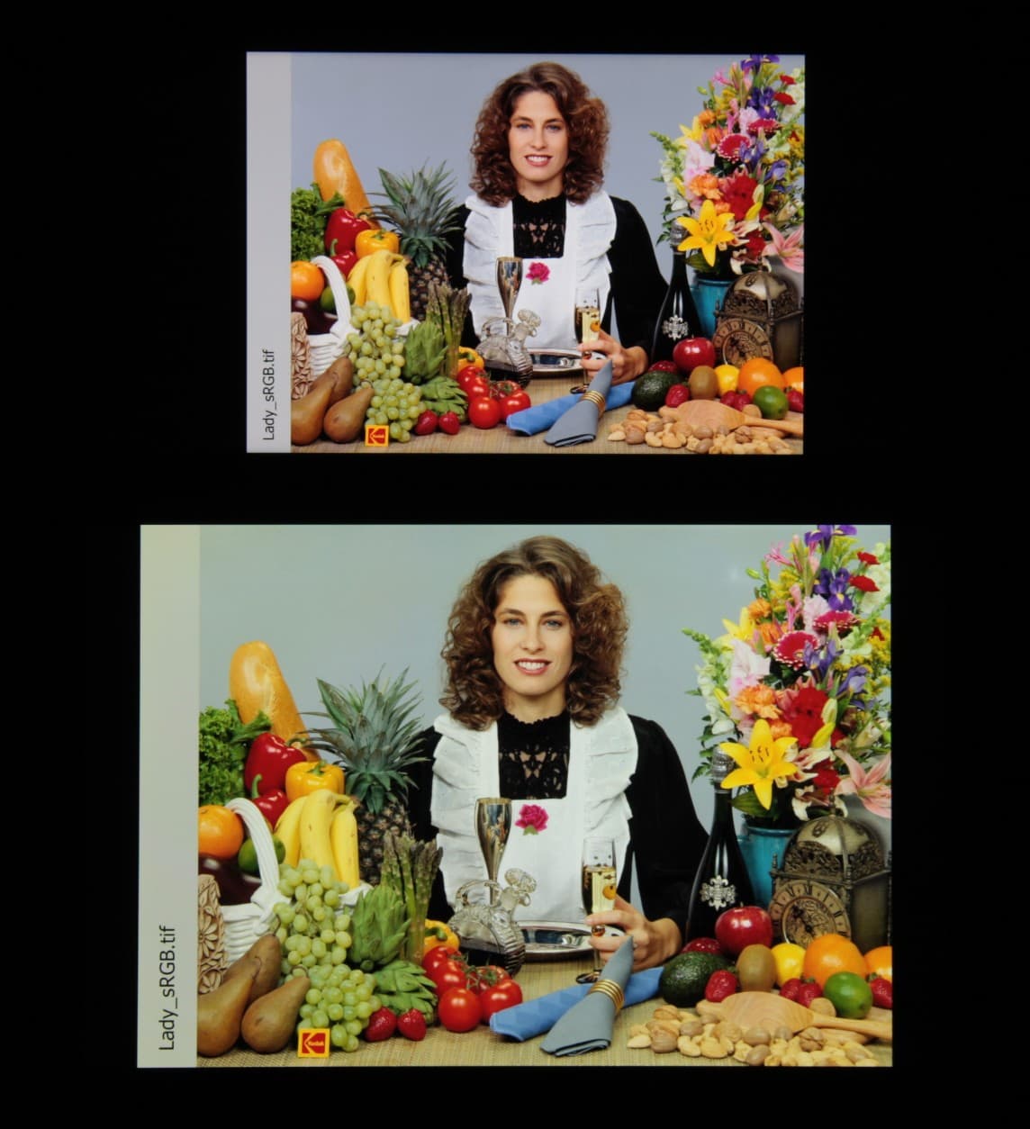 Отметим, что на экранах с широким цветовым охватом (без соответствующей коррекции) цвета́ обычных изображений, оптимизированных для устройств sRGB, выглядят неестественно насыщенными. Отсюда и рекомендация: в большинстве случаев смотреть кино, фотографии и все естественное лучше при выборе профиля Мягкий.