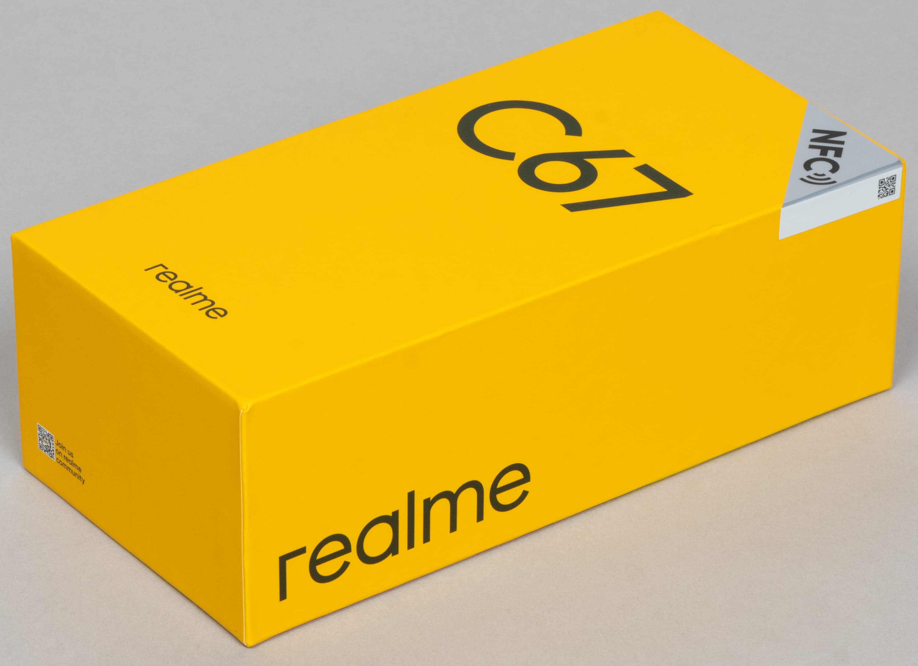 Смартфон Realme C67 поставляется в крупной картонной коробке, типично оформленной в фирменных цветах бренда.