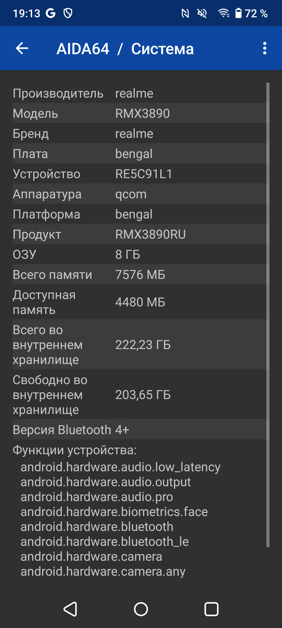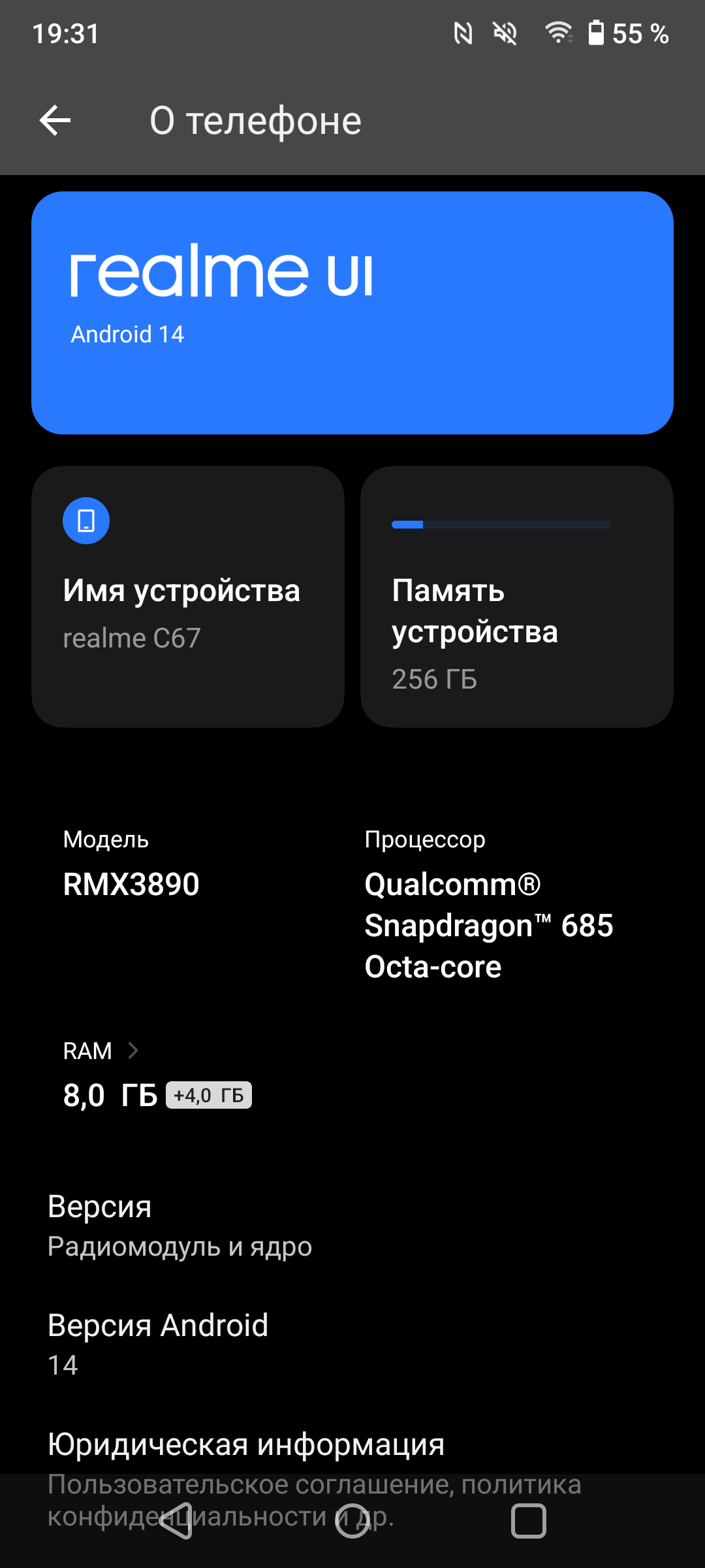 Realme C67 в качестве программной платформы использует ОС Android 14 с собственной оболочкой Realme UI последней версии. Интерфейс добротный, быстрый, но в последнее время его значительно замусорили рекламой и массой навязанных предустановленных приложений. По крайней мере, это справедливо для бюджетных серий смартфонов Realme. Из особенностей можно упомянуть пресловутый Dynamic Island вокруг фронтальной камеры, но им сейчас уже никого не удивишь, китайцы массово кинулись внедрять эту визуальную функцию во все свои смартфоны. Верхняя шторка не разделена на две части в зависимости от угла оттягивания. Официальный доступ к магазину и приложениям Google на месте.