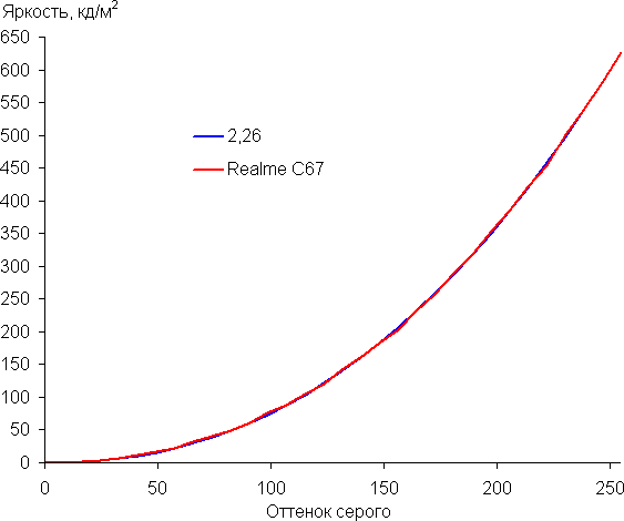 Контрастность (примерно в центре экрана) высокая — порядка 1200:1. Время отклика при переходе черный-белый-черный равно 16 мс (8 мс вкл. + 8 мс выкл.). Переход между полутонами серого 25% и 75% (по численному значению цвета) и обратно в сумме занимает 26 мс. Построенная по 32 точкам с равным интервалом по численному значению оттенка серого гамма-кривая не выявила завала ни в светах, ни в тенях. Показатель аппроксимирующей степенной функции равен 2,26, что немного выше стандартного значения 2,2, поэтому картинка чуть затемнена. При этом реальная гамма-кривая мало отклоняется от степенной зависимости: