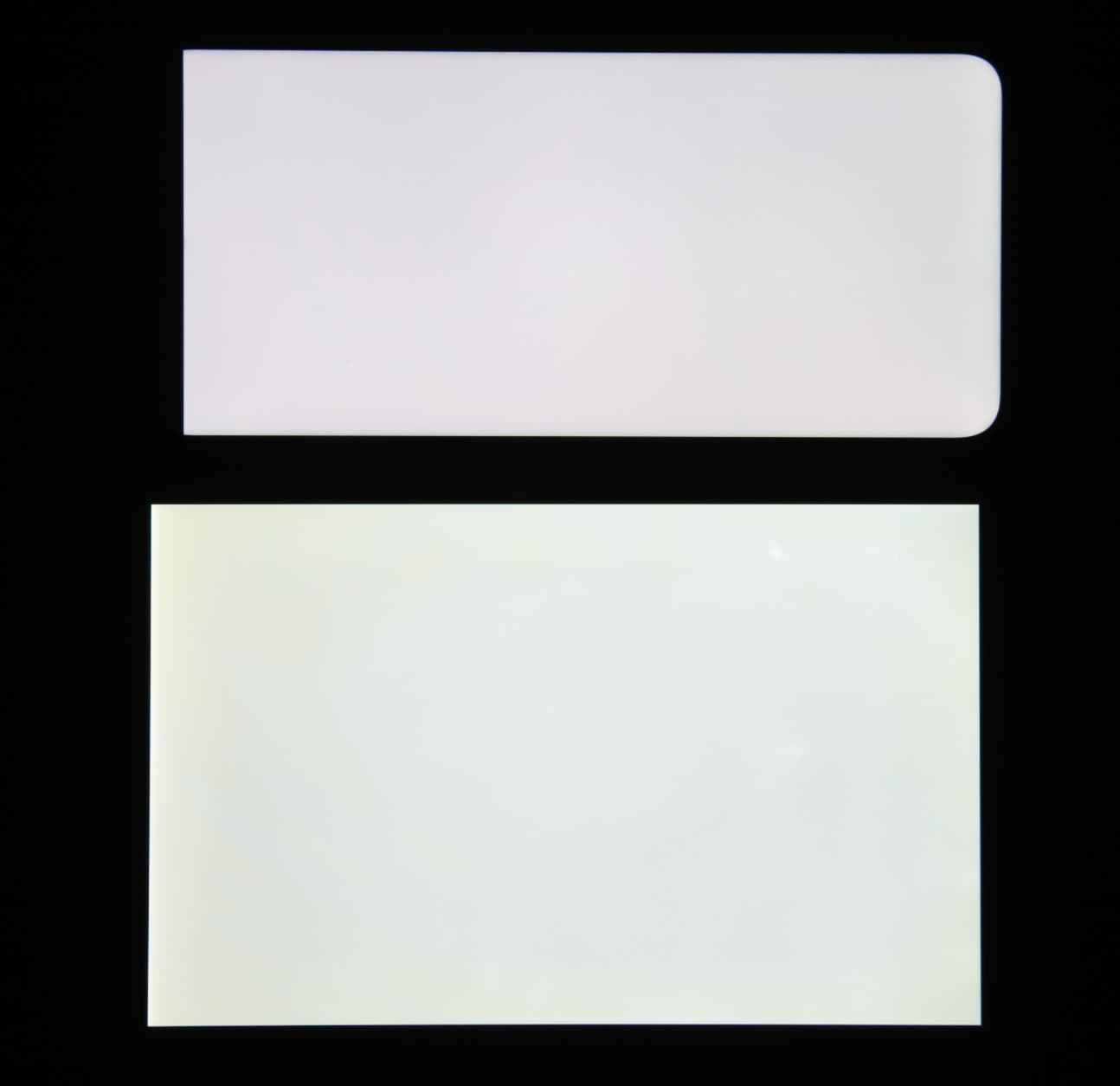 При выводе белого поля во весь экран и при ручном управлении яркостью ее максимальное значение составило 690 кд/м² (с включенным режимом повышенной яркости) в обычных условиях, а на очень ярком свету и в случае автоматической регулировки яркости оно повышается до 860 кд/м². Максимальная яркость высокая, поэтому, учитывая отличные антибликовые свойства, читаемость экрана даже в солнечный день вне помещения должна быть на приемлемом уровне. Минимальное значение яркости — 3 кд/м². В полной темноте яркость можно понизить до комфортного значения. В наличии автоматическая регулировка яркости по датчику освещенности (он находится справа от решетки фронтального громкоговорителя, очень близко к верхнему краю фронтальной панели). В автоматическом режиме при изменении внешних условий освещенности яркость экрана как повышается, так и понижается. Работа этой функции зависит от положения ползунка регулировки яркости: им пользователь может попытаться выставить желаемый уровень яркости в текущих условиях. Если не вмешиваться, то в полной темноте функция автояркости уменьшает яркость до 3 кд/м² (темновато), в условиях освещенного искусственным светом офиса (примерно 550 лк) устанавливает на 200 кд/м² (нормально), а условно под прямыми лучами солнца повышает до 860 кд/м² (до максимума). Результат нас не совсем устроил, поэтому в полной темноте мы чуть увеличили яркость, получив в итоге для трех условий, указанных выше, следующие значения: 25, 260 и 860 кд/м² (идеальное сочетание). Получается, что функция автоподстройки яркости работает адекватно и в какой-то степени позволяет пользователю настраивать свою работу под индивидуальные требования. На любом уровне яркости значимая модуляция подсветки отсутствует, поэтому нет и никакого мерцания экрана.