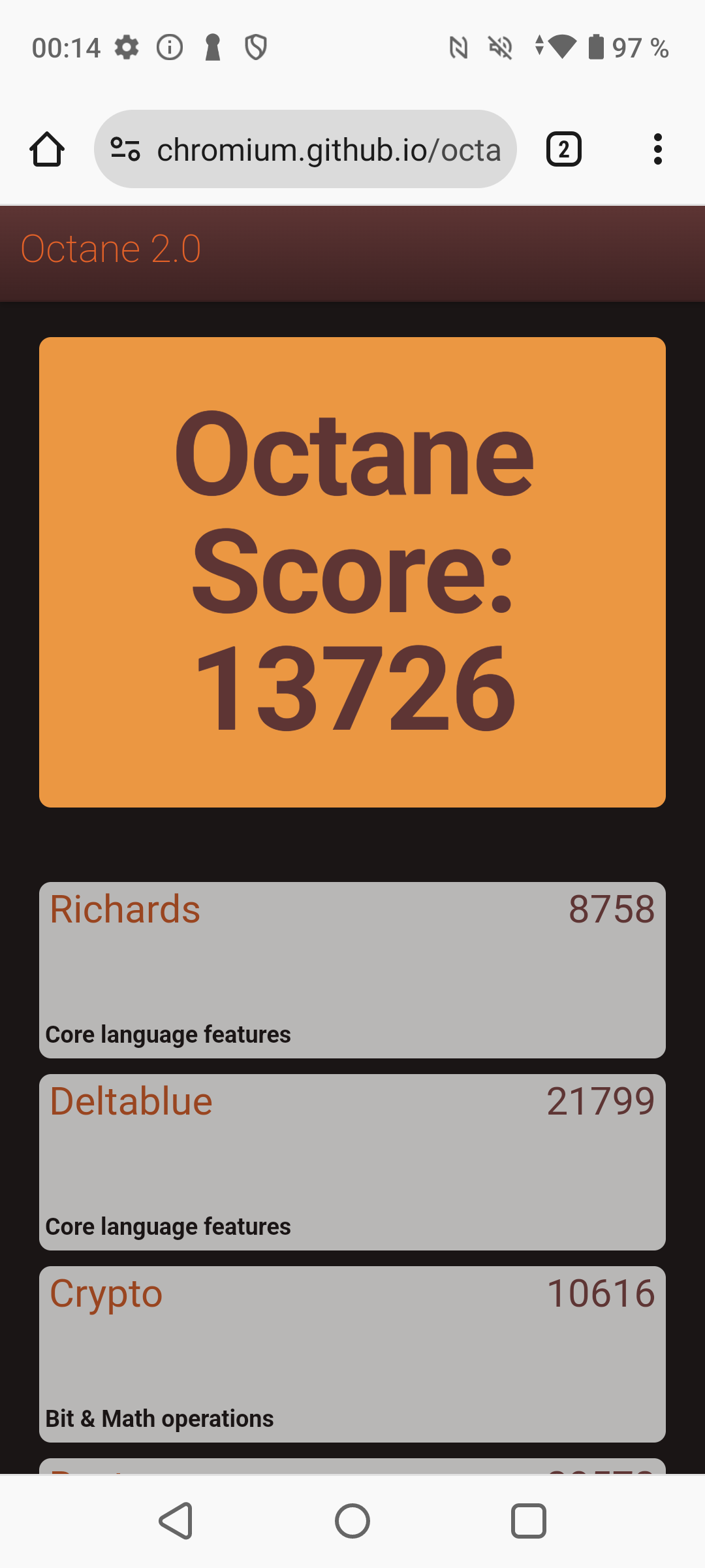| Google Octane 2 (больше — лучше) | 13726 | 14930 | 23502 | 27070 | 19194 |