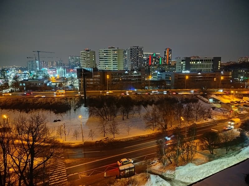 К сожалению, чувствительности сенсора недостаточно даже для вечерних условий освещенности, картинка начинает заметно деградировать, а после подчеркивания контурной резкости на снимках 12 Мп, например, переплетение веток выглядит очень грустно. Тем более нельзя говорить о высоком качестве ночной съемки, но все-таки и этот результат лучше, чем у большинства среднеуровневых смартфонов и даже некоторых субфлагманов. Особенно с учетом совершенно адекватной ночной экспозиции.