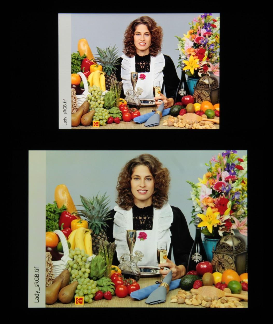 Отметим, что на экранах с широким цветовым охватом (без соответствующей коррекции) цвета́ обычных изображений, оптимизированных для устройств sRGB, выглядят неестественно насыщенными. Отсюда и рекомендация: в большинстве случаев смотреть кино, фотографии и все естественное лучше при выборе профиля Естественный.
