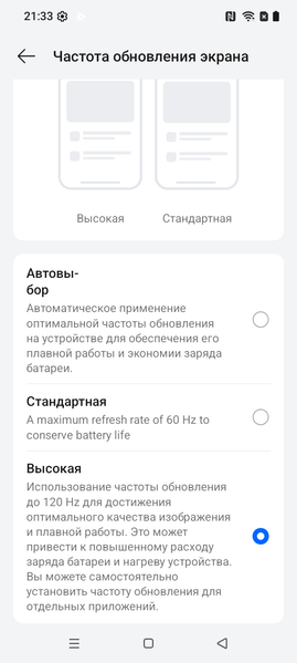 В настройках экрана можно включить режим с повышенной до 120 Гц частотой обновления, притом в режиме Автовыбор нам обещают автоматический выбор частоты: