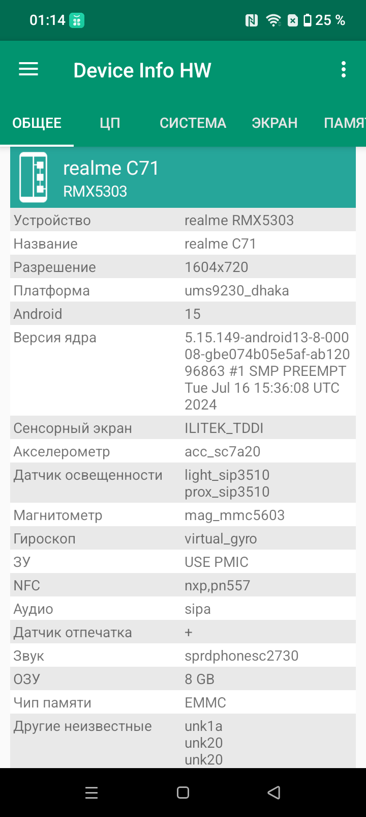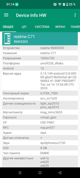 Realme C71 поддерживает мобильные сети вплоть до 4G, два диапазона Wi-Fi 5 и Bluetooth 5.2, есть поддержка NFC. Поддержки e-SIM нет. На практике в пределах городской черты московского региона аппарат демонстрирует уверенную работу в беспроводных сетях, не теряет связь, быстро восстанавливает связь после вынужденного обрыва. Все необходимые встроенные датчики на месте. Приятно, что не сэкономили даже на гироскопе. В смартфоне Realme C71 физический датчик приближения.