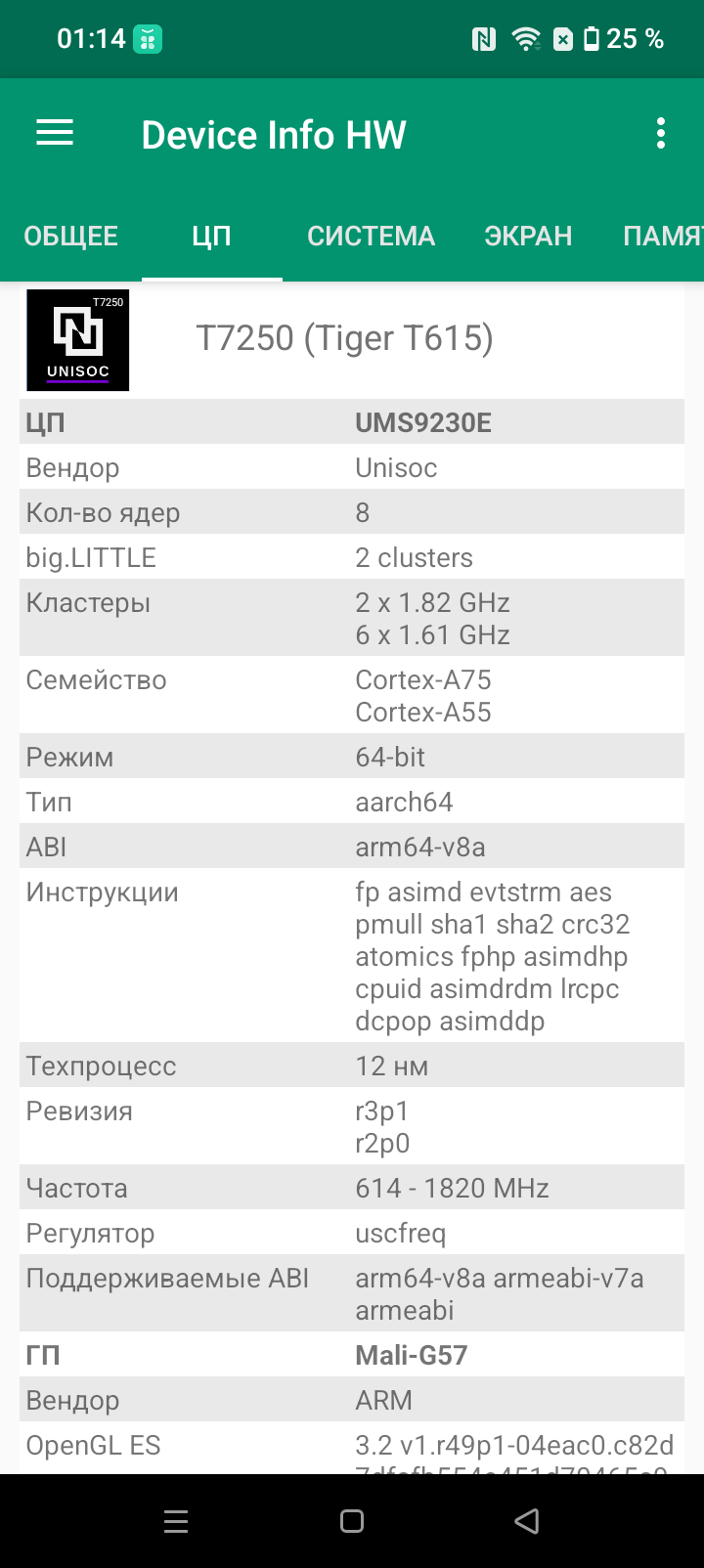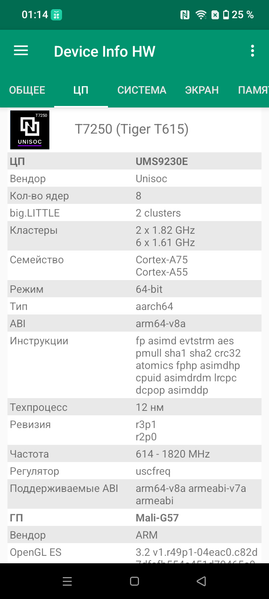 - SoC Unisoc T7250, 8 процессорных ядер (2×Cortex-A75 @1,8 ГГц + 6×Cortex-A55 @1,6 ГГц)
