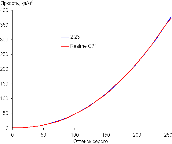 Контрастность (примерно в центре экрана) высокая — порядка 1600:1. Время отклика при переходе черный-белый-черный равно 25 мс (13 мс вкл. + 12 мс выкл.). Переход между полутонами серого 25% и 75% (по численному значению цвета) и обратно в сумме занимает 40 мс. Построенная по 32 точкам с равным интервалом по численному значению оттенка серого гамма-кривая не выявила завала ни в светах, ни в тенях. Показатель аппроксимирующей степенной функции равен 2,23, что немного выше стандартного значения 2,2. При этом реальная гамма-кривая мало отклоняется от степенной зависимости: