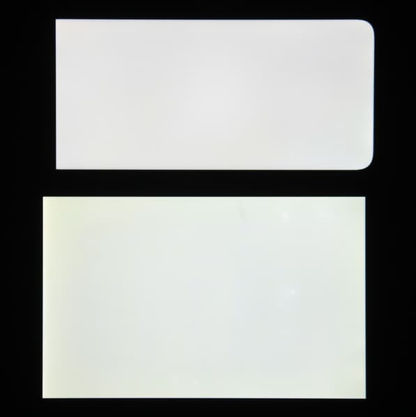 При перпендикулярном взгляде равномерность черного поля средняя — местами по краям есть засветы:
